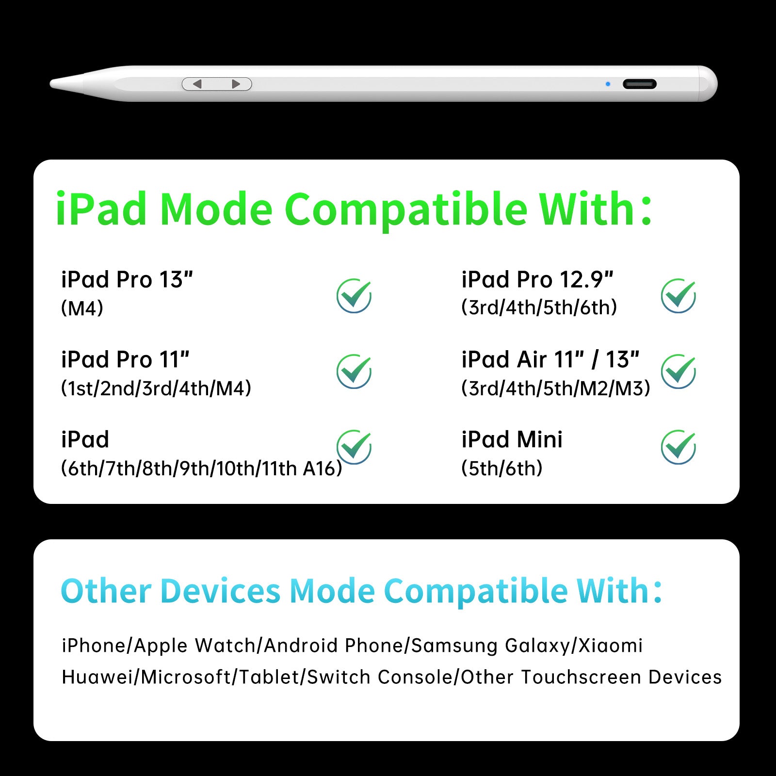 <p>In this mode, the green LED indicator lights up. This apple pencil usb c is compatible with the following devices: 13-inch/11-inch iPad Pro M4, 12.9-inch iPad Pro (3rd to 6th generation), 13-inch/11-inch iPad Air M3/M2 (3rd to 5th generation), iPad A16